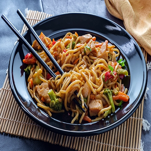 Chicken Lo Mein is a savory noodle dish made with tender chicken, stir-fried noodles, and crisp vegetables, all tossed in a rich, flavorful sauce. It offers a delicious mix of soft noodles, juicy chicken, and umami-packed flavors in every bite.